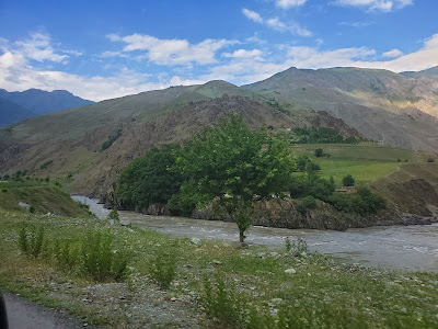 The bridge between the two countries is closed, mostly, although it does open once a week for a few hours to allow local trade to take place on or near the bridge. I gather this once-a-week-opening is common now along the Panj River wherever there is a bridge. The people living on the Afghan side of the river are Tajiks, too, and apparently some of the men appreciate being able to come over and enjoy alcohol, which is now forbidden in Taliban Afghanistan. You cannot make it out especially well in the photo below, but the Afghan flag is flying on the bridge, and it is the white flag of the Taliban, not the black/red/green tricolour flag that in some form or another had been the Afghan flag for almost one hundred years.
